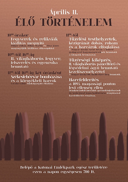A 70 éve véget ért világháború háborús mindennapjait katonai hagyományőrzők elevenítik fel tüzérségi bemutató keretében légvédelmi ágyúval, valamint a lövészárokharc sajátosságainak bemutatásával.