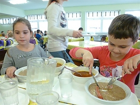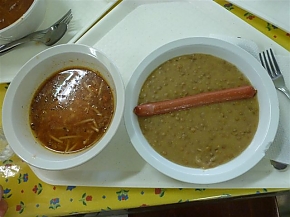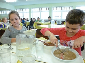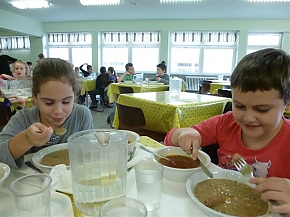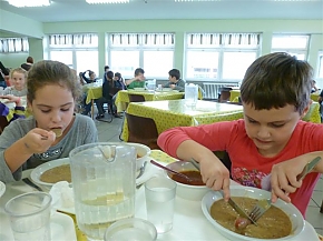 Eltekintve az ebédlő – egyébként kedves, gyerekduruzsolással teli – alapzajától, rendkívül jó első benyomást keltett bennem az Arany János és Eötvös iskola közös étkezője. Takaros asztalok, tiszta helyiség, pedáns külsejű és kedves konyhás nénik, türelmes tanítók, tanárok és egymással pacsizó, csacsogó, de szépen várakozó kisebb és nagyobb gyerekek fogadtak. Utoljára több mint húsz évvel ezelőtt ebédeltem iskolai menzán, ugyanitt. Beálltam a sorba, figyeltem és másoltam a gyerekeket. A csütörtöki menü olasz zöldségleves és lencsefőzelék volt sült virslivel. A saját nyolcéves lányaim, de akár egy kisebb étvágyú felnőtt igényeihez mérten bőségesek voltak az adagok. Ránézésre kellemesnek tűnt mindkét fogás. A leves tele volt zöldségekkel, betétként egy kevés tészta is jutott bele, ami miatt akár a finnyásabb gyerekek is rávehetők, hogy kóstolják meg. A kóstolásról! Ez az egyik, amit gyakorló szülőként tudok – de most több gyereknél is megtapasztaltam –, hogy nagyon sokan már ránézésre elutasítják az eléjük tett ételt. Gondolom, ez nemcsak alkati jelenség, hanem életkorral járó "tünet". Nem reprezentatív közvélemény-kutatást is tartottam az éppen akkor és ott ebédelő gyerekek körében. Egyikük azt mondta, hogy azért nem evett a levesből, mert rágógumi volt benne. Azt feltételezem inkább, hogy a tálaláskor tetejére tett reszelt sajt gombócosodott össze. De talán ez az eset is alátámasztja, hogy milyen könnyen és sokszor téves gondolatok vagy információk alapján hagyják érintetlenül az ételt az iskolások. A vélemény nagyon gyorsan terjed, apró szájról szájra, és nagy hatással van a többiekre.