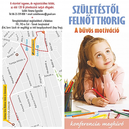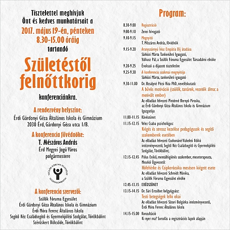 A pedagógusok, szülők és segítő szakemberek körében méltán népszerű programra idén Érden, a Gárdonyi Géza Általános Iskola és Gimnázium épületében kerül sor T. Mészáros András polgármester fővédnöksége mellett. A konferencia társszervezői a házigazda tanintézmény, az Érdi Móra Ferenc Általános Iskola és a törökbálinti Családsegítő és Gyermekjóléti Szolgálat, valamint Szérűskert Bölcsőde. A két iskola tanítás nélküli munkanapot tart a rendezvény alatt.