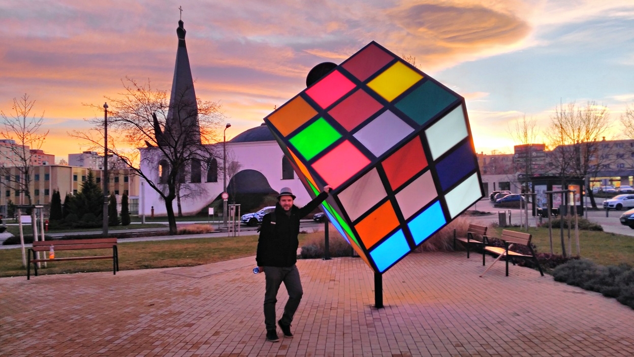 és hogy itt már most található egy látványos Rubik kocka, mint térdíszítő elem, aminek épületformátumú nagy testvéréért régóta szorítok Budapesten valami méltó helyszínen.