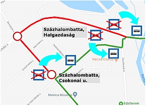 A felújítás ideje alatt a Volánbusz járatai - a 708-as, a 710-es, a 712-es és a 715-ös - terelt útvonalon, ideiglenes megállóhelyekkel közlekednek. A Halgazdaság megállót Dunafüred irányában az Erőmű útra, a körforgalom elé, a DE Zrt. Főkapu irányában pedig a Pannónia utcába helyezik át. A Csokonai utcai megállót Dunafüred irányában szintén a Pannónia utcába helyezik át.