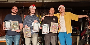 A 2025-ös Mikulás-slam eredményei: első helyezett Csősz Gergő (Budapest), második helyezett Glózer Ádám (Érd), harmadik helyezett Dénes Szilveszter (Pécs).