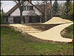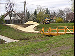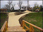 Elkészült a tóhoz vezető sétány lejárata. Kulturált, esztétikus, tájba illő. A kerti murvával szórt lejáratot hasított facölöp szegélyek közé szórták.