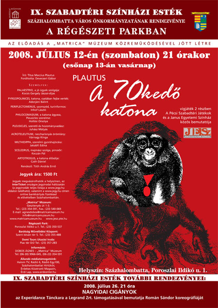 Folytatásként július 12-én 21 órakor várják az érdeklődőket Plautus: A hetvenkedő katona című komédiájára a Pécsi Szabadtéri Játékok és a Pécsi Janus Egyetemi Színház közös bemutatójára.