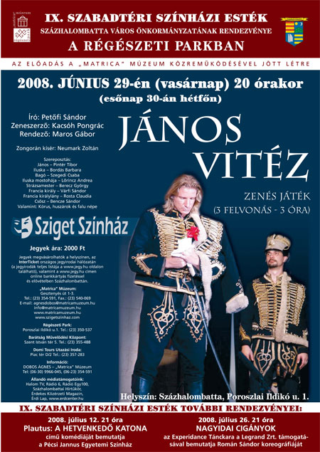 Június 29-én 20 órakor a nyitórendezvényen Petőfi Sándor költeményét a János vitéz című zenés játékot láthatja a közönség a Sziget Színház előadásában, Pintér Tibor főszereplésével. A költemény Petőfi legnépszerűbb alkotásai közé tartozik. A népmesék közül a tündérmesékkel tart rokonságot, mert csodás lényeket vonultat fel és csodás események történnek benne. A darabban a magyar irodalom örökkön élő figurája elevenedik meg, a kukoricásban született János, aki példamutató szerelmével és örök hűségével Iluska iránt, klasszikus értékrendre tanít minket egy fantasztikus mesén keresztül. A darabot rendezte Maros Gábor, zenéjét szerezte Kacsóh Pongrác. Szereplők: Bordás Barbara, Szegedi Csaba, Lőrincz Andrea, Berecz György, Várfi Sándor, Rosta Claudia, Bencze Sándor valamint: Kórus, huszárok és falu népe. A szigetszentmiklósi Sziget Színház Pintér Tibor vezetésével már nem először mutatkozik be a Régészeti Parkban, a színművészt a helyszín is megihlette és 2004-ben megírta Százhalombatta himnuszát.