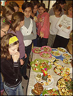 Ennek egyik látványos megnyilvánulása a „hangulatszoba”, amit a 7.c rendezett be napról napra, más és más színekkel. Csütörtökön megpróbáltam átfúrni magam a számtalan korosztályból összeverbuválódott érdeklődők tömegén az aranybarnára berendezett szobácskába. A falakon, a heverőn, az asztalokon textilek, kiegészítők: illatmécses, tobozok, szárazvirág-kompozíció, szobrok és faliképek a meleg barna minden árnyalatában.