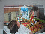 Mária egy gyermekkori betegségből adódóan nem tudja használni a végtagjait, a kórházban, tanárai ösztönzésére tanult meg a szájával dolgozni. Az alkotásban a férje által készített speciális állvány segíti, amire egy lehajtható tükör is fel van szerelve.
